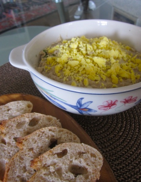 Кладем в салатницу или форму, украшаем желтком, накрываем и ставим в холодильник минимум на 3 часа. Подаем с хорошим свежим хлебом.