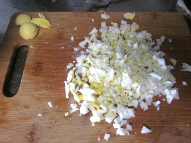 Яйца мелко рубим. (Половинку одного желтка оставляем для украшения.)