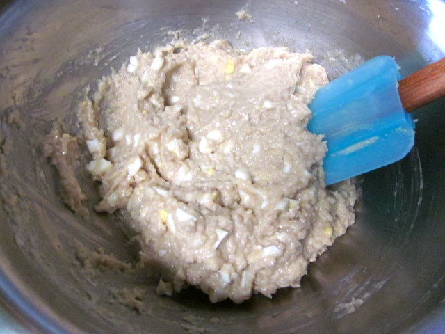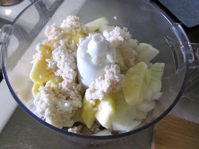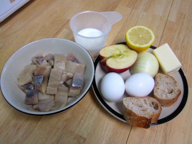 [Примечание: Мне очень понравился этот форшмак по вкусу, но текстура показалась слишком гладкой. Я бы предпочла мелко нарубленные кусочки сельди. В следующий раз я сделаю пюре из яблока, лука и хлеба, а сельдь измельчу ножом. Мне кажется, так будет интереснее.]